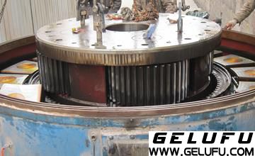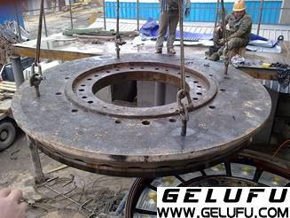 減速機(jī)回裝是拆除的反工序,遵循先出后進(jìn)的規(guī)律,回裝時(shí)必須細(xì)心,不得遺忘任何部件,尤其是油管,回裝時(shí)必須繪制各部件的結(jié)構(gòu)圖,按圖逐項(xiàng)落實(shí)。回裝中 困難的是三聯(lián)齒輪系的安裝,因?yàn)橐环矫嫒齻€(gè)齒輪內(nèi)部要與下面的傳動(dòng)齒輪軸同時(shí)嚙合,另一方面三個(gè)齒輪必須與大齒圈同時(shí)嚙合,而下面的齒輪軸有一定的活動(dòng)間隙,所以安裝時(shí)必須放慢速度,必須使齒輪系保持水平,同時(shí)上下都有人時(shí)時(shí)查看,及時(shí)糾偏。