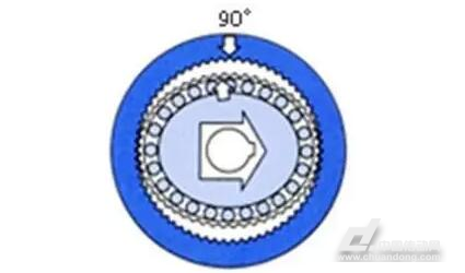 波發(fā)生器是使柔輪產(chǎn)生可控彈性變形的構(gòu)件。當(dāng)波發(fā)生器裝入柔輪后,迫使柔輪的剖面由原先的圓形變成橢圓形,其長軸兩端附近的齒與剛輪的齒完全嚙合,而短軸兩端附近的齒則與剛輪完全脫開。周長上其他區(qū)段的齒處于嚙合和脫離的過渡狀態(tài)。當(dāng)波發(fā)生器沿圖示方向連續(xù)轉(zhuǎn)動時,柔輪的變形不斷改變,使柔輪與剛輪的嚙合狀態(tài)也不斷改變,由嚙入、嚙合、嚙出、脫開、再嚙入……,周而復(fù)始地進行,從而實現(xiàn)柔輪相對剛輪沿波發(fā)生器H相反方向的緩慢旋轉(zhuǎn)。工作時,固定剛輪,由電機帶動波發(fā)生器轉(zhuǎn)動,柔輪作為從動輪,輸出轉(zhuǎn)動,帶動負載運動。在傳動過程中,波發(fā)生器轉(zhuǎn)一周,柔輪上某點變形的循環(huán)次數(shù)稱為波數(shù),以n表示。常用的是雙波和三波兩種。