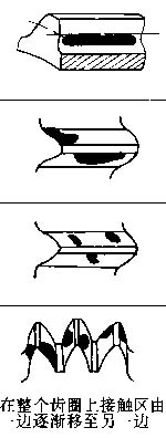 騙齒頂接觸,兩齒輪中心距過大 | 在中心距公差范圍內(nèi),刮削軸瓦或調(diào)整軸承座 | 沿齒向游離接觸,齒輪端面與回轉(zhuǎn)軸線不垂直 | 檢查、校正齒輪端面與回轉(zhuǎn)軸線的垂直度 |