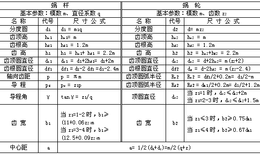 蝸桿蝸輪的主要參數(shù)有:模數(shù)m、蝸桿分度圓直徑d、導(dǎo)程角γ、、中心距a、蝸桿頭數(shù)z1、蝸輪齒數(shù)z2等,根據(jù)上述參數(shù)可決定蝸桿與蝸輪的基本尺寸,其中z1、z2由傳動(dòng)要求選定。幾何尺寸計(jì)算如下表所示。