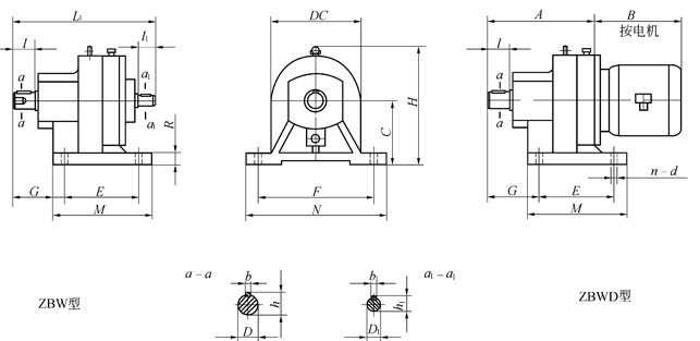 ZBW、ZBWD臥式變幅擺線齒輪減速機(jī)外形和安裝尺寸