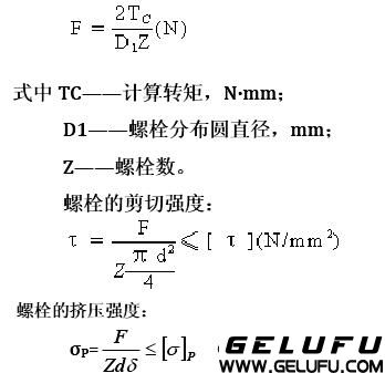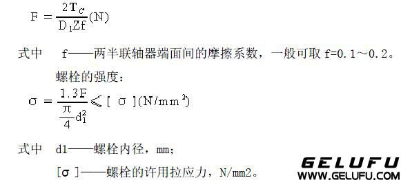[T]——螺栓材料的許用剪應(yīng)力,載荷穩(wěn)定時(shí),可取[T]=0.4σS,載荷變化時(shí),可取[T]=(0.2~0.25)σS,σS為螺栓材料的屈服極限; [σ]P——許用擠壓應(yīng)力,N/mm2,載荷穩(wěn)定時(shí),對(duì)鋼可取[σ]P=(0.8~1)σS,對(duì)鑄鐵可取[σ]P=0.8[σ]b;載荷變化時(shí),對(duì)鋼可取[σ]P=(0.5~0.65)[σ]S;對(duì)鑄鐵可取[σ]P=0.5[σ]b,其中[σ]b為材料的拉伸強(qiáng)度極限。 普通螺栓聯(lián)接,裝配時(shí)須擰緊螺栓,靠?jī)砂肼?lián)軸器端麵之間發(fā)生的摩擦力傳遞轉(zhuǎn)矩,每一螺栓的預(yù)緊力為: