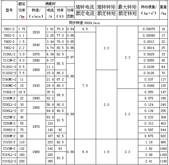 Y係列(IP44)三相異步電動(dòng)機(jī)主要技術(shù)參數(shù)(同步轉(zhuǎn)速3000r/min)