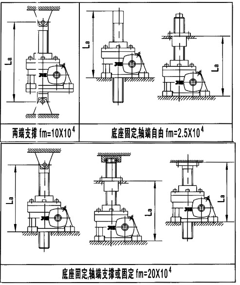 Pcr—絲桿臨界載荷(N) fm—長度係數(shù)(詳見附表4) d—絲桿底徑(mm)(詳見附表5)