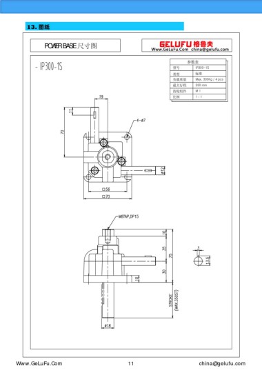 13. 圖紙 POWER BASE 尺寸圖 參數(shù)表 型號(hào) IP300-1S 類型 標(biāo)準(zhǔn) 負(fù)載重量 Max. 300Kg / 4 pcs 最大行程 350 mm 齒輪組件 M 1 比例 1 : 1 m.eghtebas.com 11 china@gelufu.com