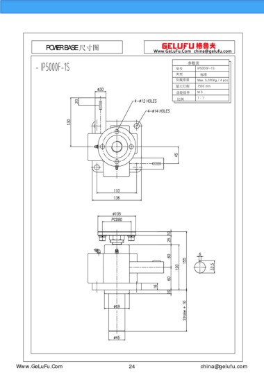 POWER BASE 尺寸圖 參數(shù)表 型號(hào) IP5000F-1S 類型 標(biāo)準(zhǔn) 負(fù)載重量 Max. 5,000Kg / 4 pcs 最大行程 1500 mm 齒輪組件 M 3 比例 1 : 1 m.eghtebas.com 24 china@gelufu.com