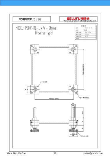 POWER BASE 尺寸圖 參數(shù)表 型號(hào) IP500F-4S-RE 類型 標(biāo)準(zhǔn) 負(fù)載重量 Max. 500Kg 最大行程 600 mm 齒輪組件 M 1.5 比例 1 : 1 m.eghtebas.com 36 china@gelufu.com