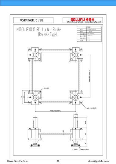 POWER BASE 尺寸圖 參數(shù)表 型號 IP3000F-4S-RE 類型 標(biāo)準(zhǔn) 負(fù)載重量 Max. 3000Kg 最大行程 1500 mm 齒輪組件 M 3 比例 1 : 1 m.eghtebas.com 39 china@gelufu.com