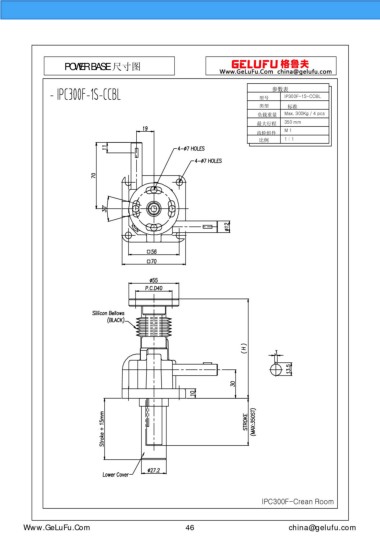 POWER BASE 尺寸圖 參數(shù)表 型號 IP300F-1S-CCBL 類型 標準 負載重量 Max. 300Kg / 4 pcs 最大行程 350 mm 齒輪組件 M 1 比例 1 : 1 IPC300F-Crean Room m.eghtebas.com 46 china@gelufu.com