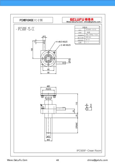 POWER BASE 尺寸圖 參數(shù)表 IPC500F-1S-CC 型號 類型 標準 Max. 500Kg / 4 pcs 負載重量 600 mm 最大行程 齒輪組件 M 1.5 比例 1 : 1 IPC500F-Crean Room m.eghtebas.com 48 china@gelufu.com