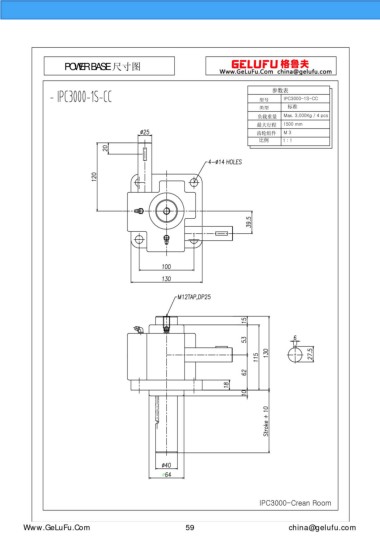 POWER BASE 尺寸圖 參數(shù)表 型號(hào) IPC3000-1S-CC 類型 標(biāo)準(zhǔn) 負(fù)載重量 Max. 3,000Kg / 4 pcs 最大行程 1500 mm 齒輪組件 M 3 比例 1 : 1 IPC3000-Crean Room m.eghtebas.com 59 china@gelufu.com