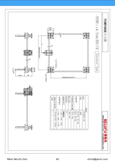 POWER BASE 尺寸圖 標(biāo)準(zhǔn) NMRV030 m.eghtebas.com 比例 減速后升降舉例 65 減速機(jī)速比 減速機(jī)型號(hào) 齒輪組件 最大行程 升降速度(1rev/mm) 負(fù)載重量 類型 型號(hào) 參數(shù)表 china@gelufu.com