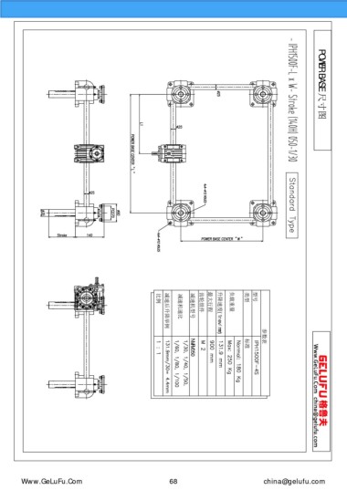 BASE 尺寸圖 比例 減速后升降舉例 減速機(jī)速比 減速機(jī)型號(hào) 齒輪組件 最大行程 升降速度(1rev/mm) 負(fù)載重量 類型 型號(hào) 參數(shù)表 POWER 標(biāo)準(zhǔn) NMRV050 m.eghtebas.com 68 china@gelufu.com