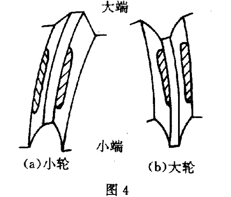 (2)頂根接觸區(qū)(圖4) 輪齒的一側(cè)面接觸區(qū)在齒頂,另一側(cè)面的接觸區(qū)在齒根,且小輪位于正確的安裝距上;齒輪副的側(cè)隙也正確,則應(yīng)該是小輪和(或)大輪的輪齒制造誤差,