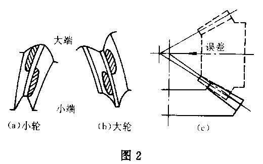 *小頂大根式 即輪齒接觸區(qū)位于小輪齒面的齒頂和大輪齒面的齒根,這是由小輪安裝距不正確引起的,應(yīng)沿軸問移出小輪,為保證側(cè)隙和接觸區(qū)也可能需要沿軸向移入大輪(圖2)。這種情況大輪凸面的接觸區(qū)靠近小端,凹面接觸區(qū)應(yīng)靠近大端,而小輪接觸區(qū)與大輪的正好相反。