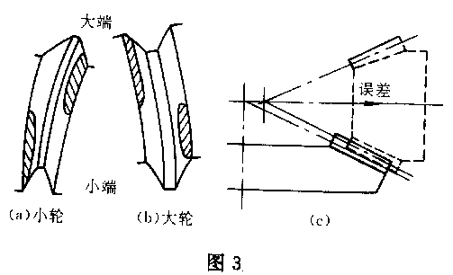 *小根大頂式 即輪齒接觸區(qū)位于小輪齒面齒根和大輪齒面的齒頂,也由小輪安裝距誤差引起的,應(yīng)沿軸向移入小輪,同樣為保證側(cè)隙和輪齒接觸區(qū)也可能要沿軸向移出大輪。這種情況大輪輪齒凸面上的接觸區(qū)應(yīng)靠近大端,凹面接觸區(qū)應(yīng)靠近小端,而小輪上接觸區(qū)應(yīng)與大輪的相反(圖3)。