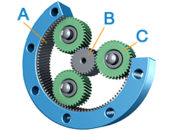 行星式齒輪減速器由一個(gè)內(nèi)齒環(huán)(A)緊密結(jié)合于齒箱殼體上,環(huán)齒中心有一個(gè)自外部動(dòng)力所驅(qū)動(dòng)之太陽齒輪(B)介于兩者之間有一組由三顆齒輪等分組合于托盤上之行星齒輪組(C)該組行星齒輪依靠著出力軸、內(nèi)齒環(huán)及太陽齒支撐浮游于期間;當(dāng)入力側(cè)動(dòng)力驅(qū)動(dòng)太陽齒時(shí),可帶動(dòng)行星齒輪自轉(zhuǎn),并依循著內(nèi)齒環(huán)之軌跡沿著中心公轉(zhuǎn),行星之旋轉(zhuǎn)帶動(dòng)連結(jié)于托盤之出力軸輸出動(dòng)力。
