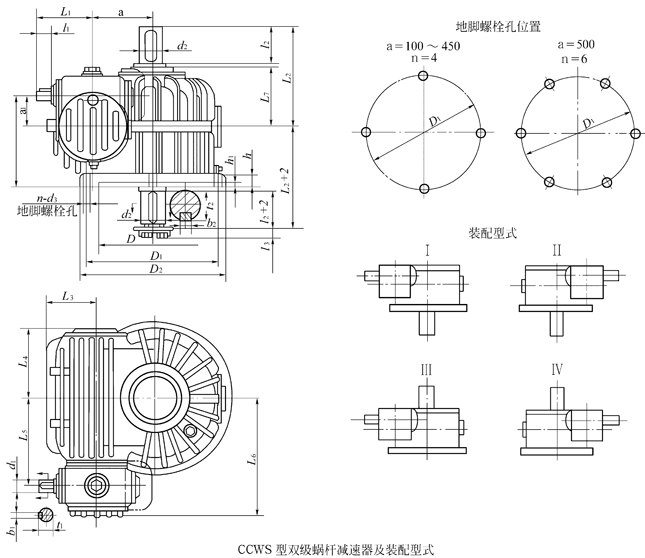 - CCWS100-CCWS500、型低速級蝸桿在蝸輪之側(cè)的雙級蝸桿減速機的裝配形式與主要尺寸(JB/T7008-1993)