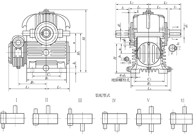 - CCWU100、CCWU125、CCWU160、CCWU200、CCWU250、CCWU315、CCWU355、CCWU400、CCWU450、CCWU500、型低速級(jí)蝸桿在蝸輪之下的雙級(jí)蝸桿減速機(jī)的裝配型式與主要尺寸(JB/T7008-1993)
