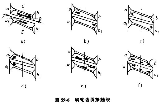圖59-6a為正常接觸,圖中AB和CD分別表示軸線中央截面,兩個箭頭所指處分別表示 ab、a1b1兩齒面的入口根據(jù)運(yùn)動精度分析,接觸斑點(diǎn)分布中央截面附近,略偏于嚙入口一端,根據(jù)潤滑條件分析,接觸斑點(diǎn)略偏于嚙出口一端有利于建立油膜。